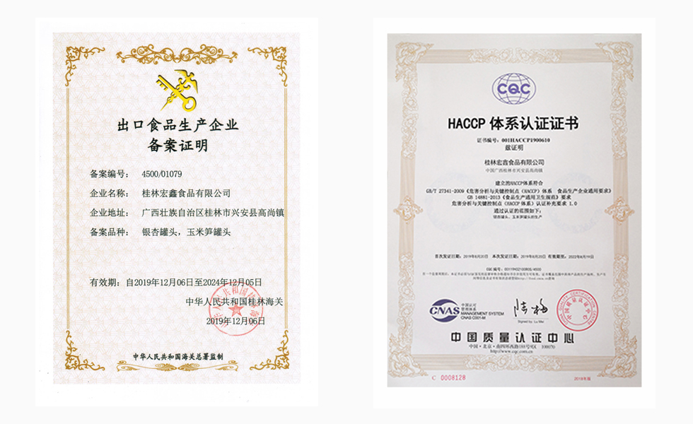 桂林宏鑫食品有限公司,從2002年開(kāi)始,專(zhuān)注于銀杏罐頭、白果罐頭、真空包裝白果仁等產(chǎn)品的加工和出口。公司通過(guò)出口食品生產(chǎn)企業(yè)備案,獲得HACCP體系認(rèn)證,具備進(jìn)口貿(mào)易資質(zhì)。